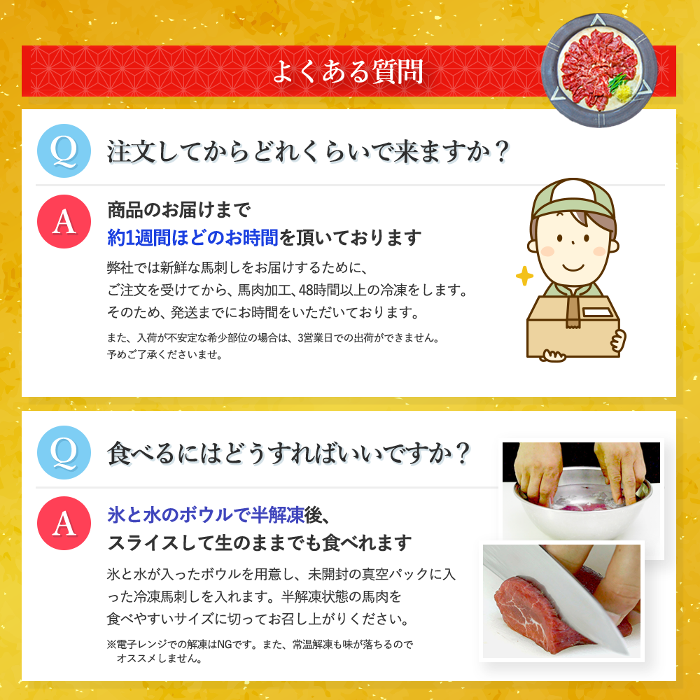 電子レンジでの解凍はNGです そして、常温解凍もオススメしません!これは、馬肉の融点が低いため馬刺しの旨み成分や程よい脂肪分が抜け出てしまうからです。