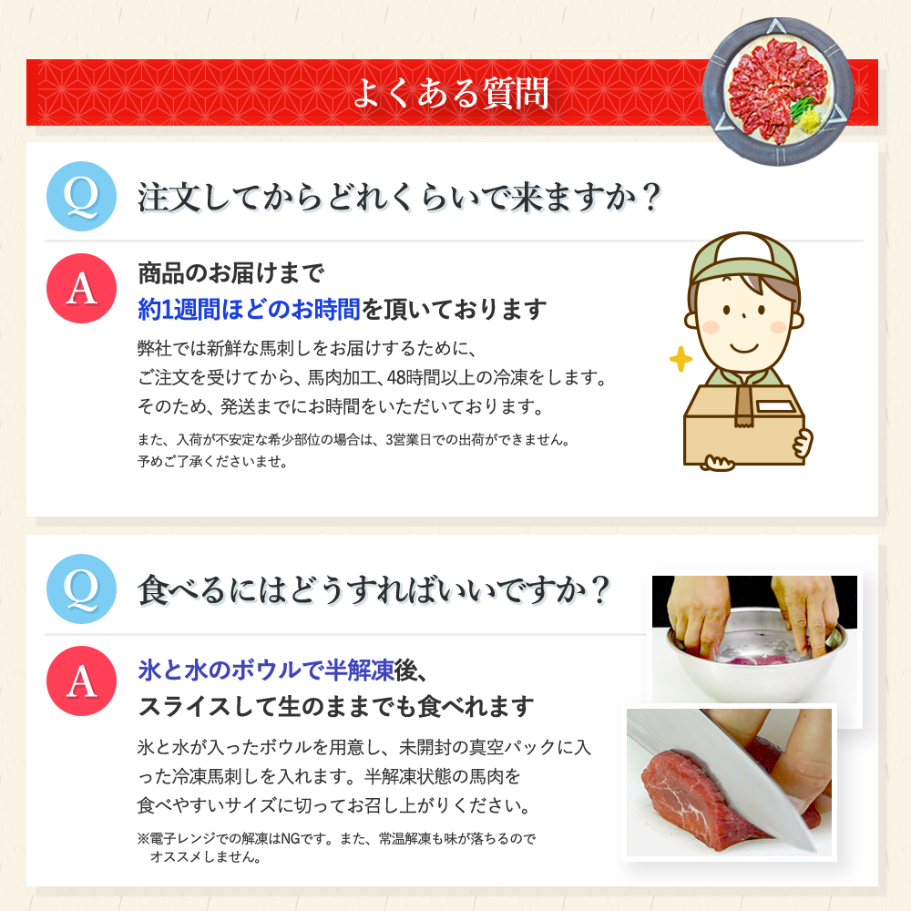 電子レンジでの解凍はNGです そして、常温解凍もオススメしません!これは、馬肉の融点が低いため馬刺しの旨み成分や程よい脂肪分が抜け出てしまうからです。